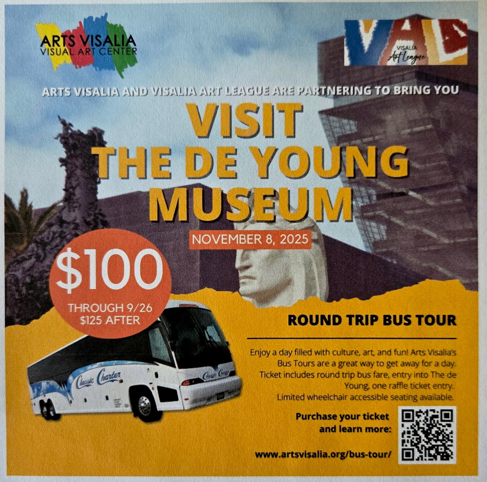 Enjoy a day filled with culture, art, and fun! Art Visalia’s Bus Tours are a great way to get away for a day. Ticket includes roundtrip bus fare, entry into The De Young, one raffle ticket entry. Limited wheelchair accessible seating available.